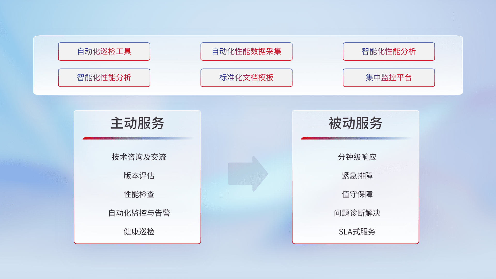 智能化工具和标准化文档,,,,保障服务质量,,提供主动服务(包含技术咨询、、、版本评估、、、、性能检查、、、自动化监控与告警、、、健康巡检)和被动服务包含(分钟级响应、、紧急排障、、、、值守保障、、、、问题诊断解决、、、SLA服务)。。